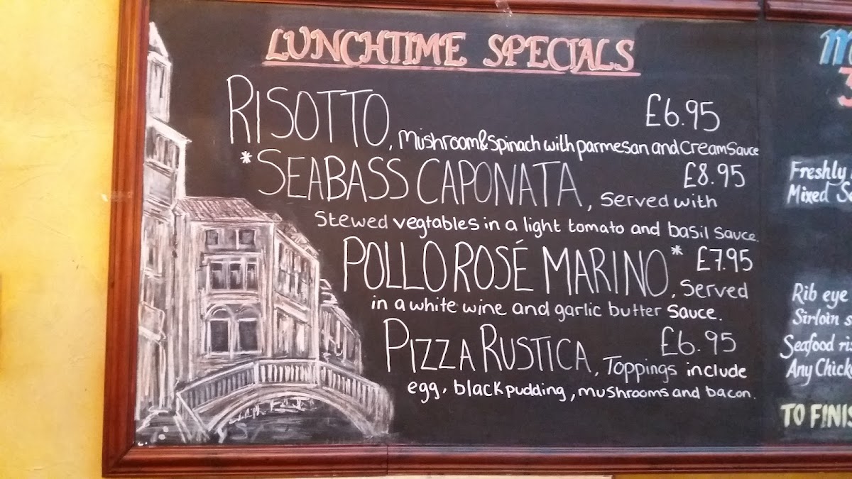 Mon-Sat 12 Noon - 5pm. (Except Bank Holidays) Minestrone Soup, Potato Skins or Liver Pate. Any Pasta, Pizza or Risotto From the Menu